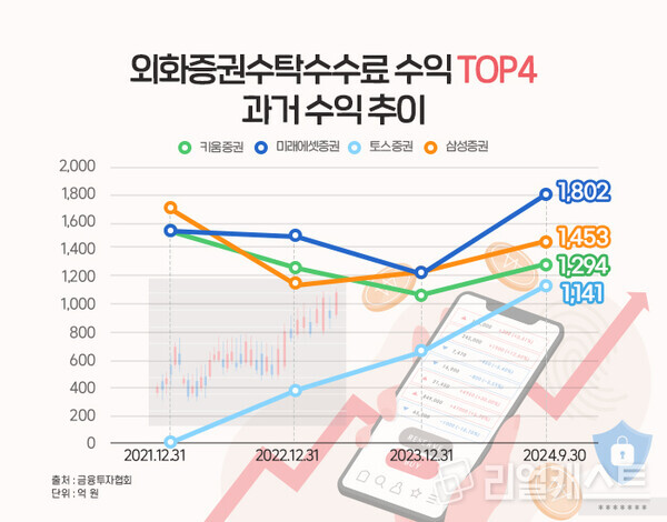 특히 2024년 3분기 누적 성적은 토스증권의 약진이 두드러집니다. 토스증권은 2024년 3분기까지 1,141억 원을 벌었습니다. 2021년에는 1억 원도 되지 않았던 외화증권수탁수수료 수익이 3년 만에 1,000배 이상 늘어 빅4에 진입했습니다.