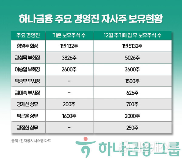 이에 따라 주요 경영진의 하나금융 자사주 보유 수는 강성묵 부회장 5026주, 이승열 부회장 3600주, 박종무 부사장 1500주, 김미숙 부사장 626주, 강재신 상무 700주, 박근훈 상무 2000주, 강정한 상무 250주로 확인됐습니다.