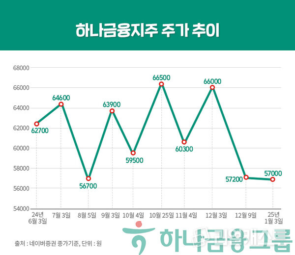 지난 10월 25일 최고 6만 9200원까지 찍었던 하나금융지주 주가는 이후 반등을 이어가다 지난달 9일 5만 6400원으로 최근 3개월 내 최저점 수준까지 내려왔기 때문입니다.