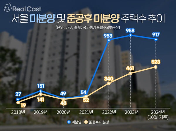 국토교통부와 KB부동산 등에 따르면 최근 지난해 10월말 기준 서울 미분양 중에서도 악성으로 꼽히는 준공 후 미분양 단지는 523가구로 집계됐습니다.