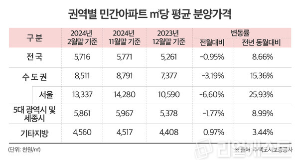 주택도시보증공사의 ‘12월 민간아파트 분양가격 동향’에 따르면 12월 전국 민간아파트 ㎡당 평균 분양가는 571.6만원으로 11월 분양가(577.1만원) 대비 0.95% 하락했다(공포직전 12개월 동안 분양보증서가 발급된 민간 분양사업장의 평균가격).