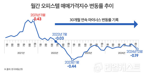 이로써 오피스텔 매매가격지수는 2022년 7월(-0.03%) 마이너스로 돌아선 이후 30개월 동안 단 한번도 플러스 변동률을 기록한 달이 없다.