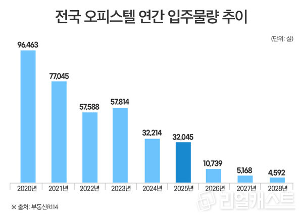 2023년 5만7,800여실이 입주를 끝으로 오피스텔 입주물량은 꾸준하게 줄어들었으며 올해는 3만2,045실이 입주할 예정이다. 오피스텔 매매시장 상황으로 볼 때 이 것도 적은 수준은 아니다.