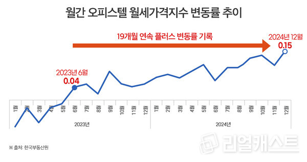 한국부동산원에 따르면 12월 기준, 전국 오피스텔 월세가격 변동률은 0.15%로 집계됐다. 2023년 6월(0.04%) 이후 19개월 연속 플러스 변동률을 이어가고 있다.