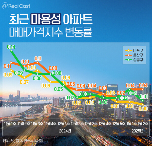 실제로 1월 2주 가격 변동률을 보면 마포구는 0.0%로 전주(0.01%) 대비 내림세로 전환했고, 용산구는 0.04%를 기록하며 전주와 동일한 수준을 유지했습니다.