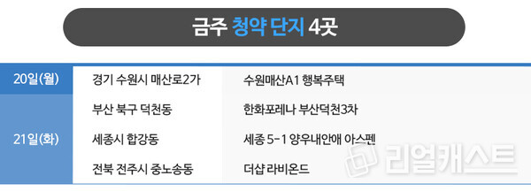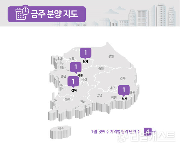 부동산인포에 따르면 1월 4주 전국에서 신규 청약 및 입주자를 모집하는 곳은 4곳, 총 3411가구로 집계됐습니다(총 가구수 기준).