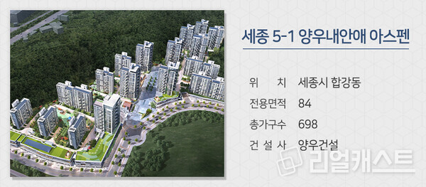 양우건설이 세종시 합강동 세종5-1생활권 첫 분양 단지인 ‘세종 5-1 양우내안애 아스펜’을 분양합니다. 세종 5-1생활권은 세종 스마트시티 국가시범도시로 지정됐으며, 단지 인근에 초·중·고교도 예정돼 있습니다. 미호천, 금강, 출동산, 합호서원 역사공원 등 녹지가 풍부합니다.