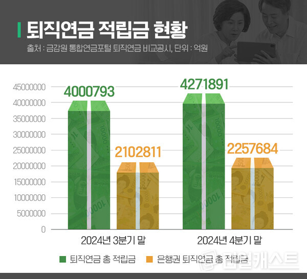 금융감독원 통합연금포털 퇴직연금 비교공시에 따르면 2024년 4분기 말 기준 적립금은 427조 1891억 원으로 확인됐습니다. 이는 2024년 3분기 말(400조 793억 원)대비 6.7% 증가한 수치입니다.