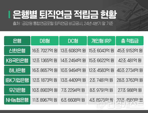 하나은행은 DB형 16조 8657억 원, DC형 10조 9494억 원, 개인형 IRP 12조 4583억 원으로 총 40조 2734억 원을 적립하고 있는 것으로 조사됐습니다.