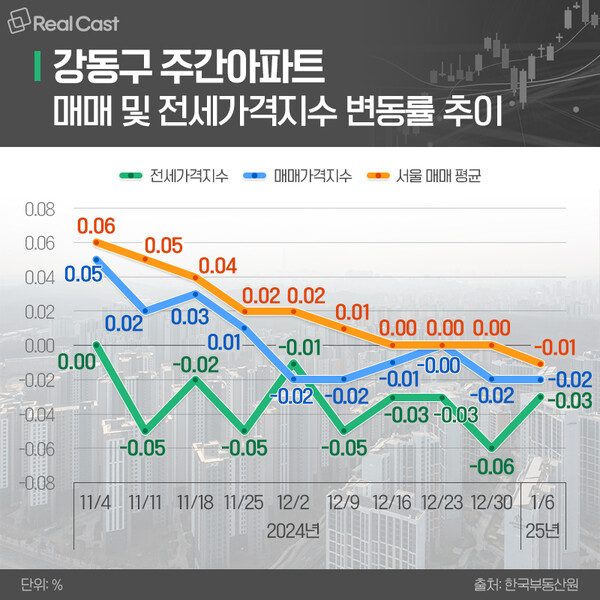 공급 과잉으로 강동구의 집값과 전셋값은 지난해 말부터 하락 일로를 겪고 있습니다. 한국부동산원에 따르면, 강동구의 주간아파트 매매가격지수 변동률은 11월 말 올파포가 입주한 직후인 12월 1주 -0.02%로 하락 전환한 뒤, 12월 4주에 보합(0.00%)을 제외하고 꾸준히 하락세를 나타내고 있는데요. 이는 서울 매매가격지수 평균값이 아직 하락률을 기록하지 않은 상태서 나타난 것이라 주목할 만합니다.