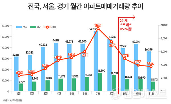 한국부동산원에 따르면 7월 전국 아파트 매매거래는 5만4,732건을 기록했으나 8월(4만7,916건), 9월(3만9,362건) 2개월 연속 감소했다.