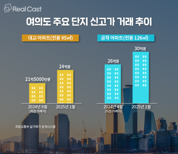 대표적으로 영등포구 여의도동 대교아파트 전용 95㎡는 올해 1월 24억원에 거래되며 신고가를 경신했습니다. 직전 거래가인 지난해 8월(21억5000만원)과 비교해 2억원 이상 뛰었습니다.