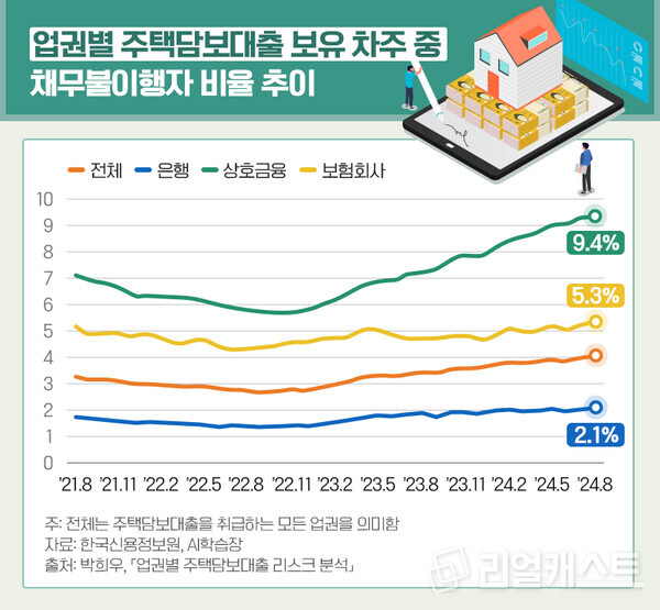 보험연구원(KIRI)의 「업권별 주택담보대출 리스크 분석」 리포트에 따르면, 한국신용정보원 AI학습장으로 분석한 결과 상호금융업권의 주택담보대출을 보유한 차주 가운데 채무불이행자 비율이 ’24년 8월 기준 9.4%에 달했다고 밝혔습니다.