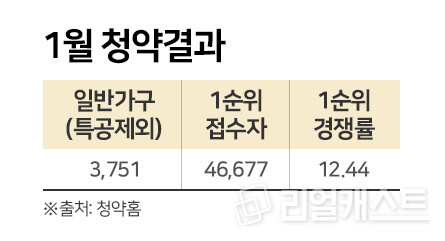 민간 물량의 청약이 이뤄진 한국부동산원 청약홈을 통해 본 1월 1순위 청약 결과는 평균 12.44 대 1로 집계 됐다(특별공급을 제외한 일반가구에 대한 청약 결과임).