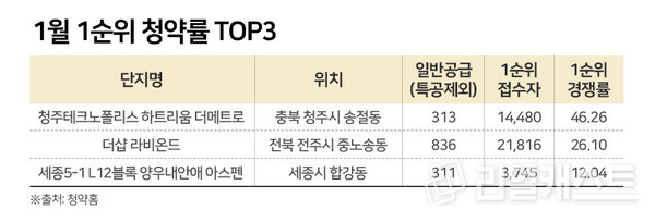 올 1월 분양시장을 이끈 곳은 크게 3곳으로 충북 청주, 전북 전주, 세종시 등이다. 공교롭게도 올해 1월에는 수도권에서는 민간 물량이 한곳도 분양을 하지 않았다.