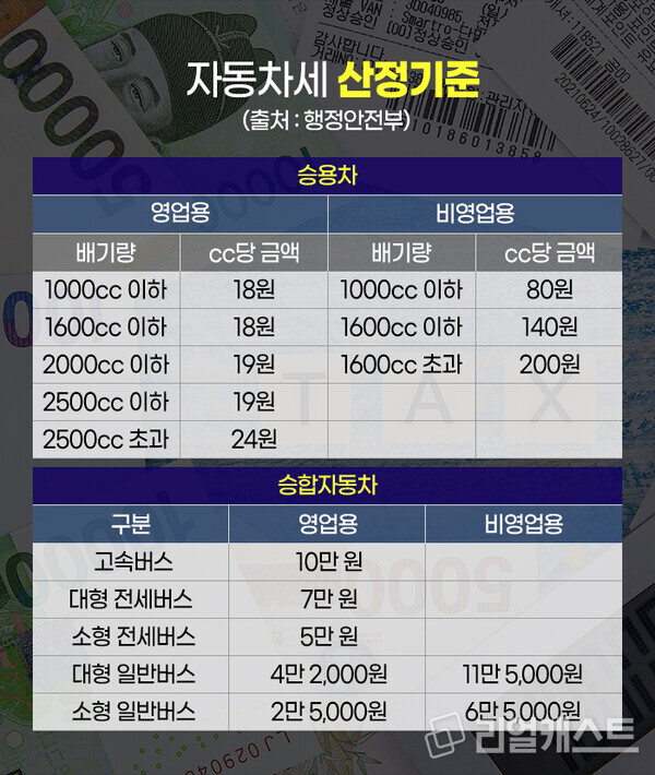 이런 가운데 자동차를 보유한 사람이라면 납부해야 하는 자동차세가 있습니다. 자동차세는 6월과 12월 절반씩 부과되는게 일반적이며 승용차의 경우 비영업용은 1000cc 이하는 cc당 80원, 1600cc 이하는 cc당 140원, 1600cc 초과는 cc당 200원을 적용해 산정됩니다.
