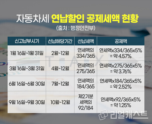 연납할인은 언제 신청했느냐에 따라 공제혜택이 달라집니다. 1월에 신청 시 약 4.57%, 3월 신청 시 약 3.76%, 6월 신청 시 약 2.52%, 9월 신청 시 약 1.25%의 자동차세 할인을 받을 수 있습니다.