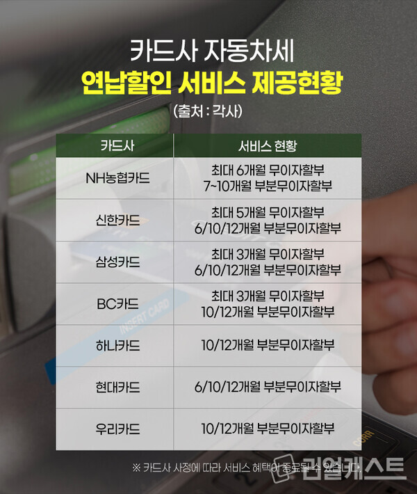 현재 NH농협·신한·삼성·BC카드는 자동차세 납부 시 무이자할부 혜택을 제공하고 있습니다. NH농협카드(대표 이민경)는 최대 6개월까지 제공하고 있으며 신한카드(사장 박창훈)는 최대 5개월, 삼성카드(대표 김이태) 및 BC카드(대표 최원석)는 최대 3개월의 무이자 혜택을 제공 중입니다.