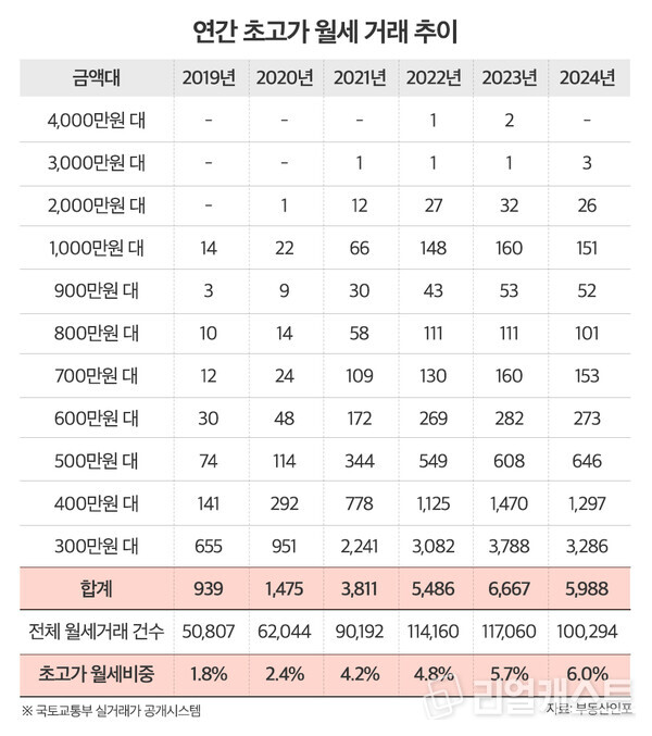 이를 보면 2024년 월 300만원 이상 월세 거래가 5,988건 이뤄졌다. 2023년(6,667건)보다는 소폭 줄어들었지만 2022년(5,486건)을 시작으로 3년 연속 5,000건을 넘었다.