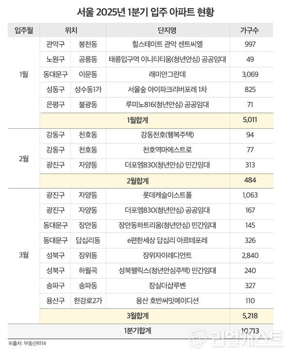 부동산R114 랩스 데이터에 따르면 올해 1분기 서울에서는 총 1만713가구가 입주할 예정이다. 지난 1월에는 동대문구 이문동 래미안그란데(3,069가구) 등 5,011가구가 입주를 시작했다.