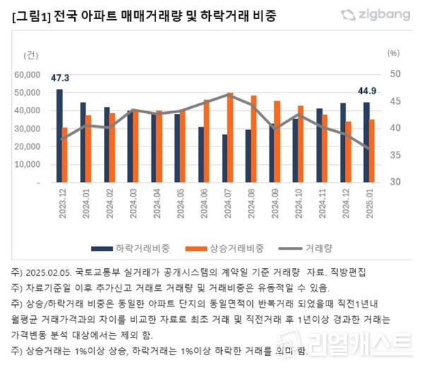 부동산플랫폼 직방에 따르면 1월 전국 아파트 실거래 내역 가운데 44.9%는 종전 거래가격 보다 낮은 가격에 거래가 됐다. 하락거래는 2024년 8월부터 증가하기 시작했으며 2024년 11월이후로는 하락거래가 상승거래 비중을 앞선 것으로 나타났다.