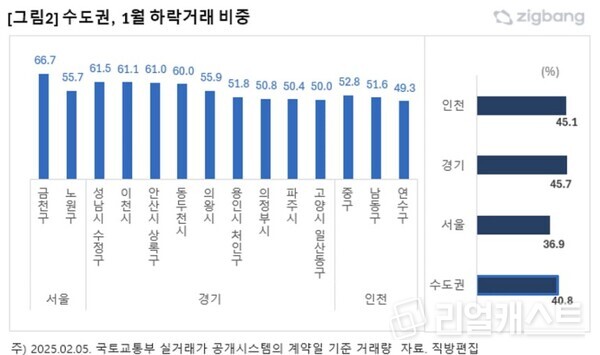 수도권에서는 서울이 36.9%로 하락거래 비중이 상대적으로 낮았지만, 지역별로 들여다보면 온도차가 확연하다.