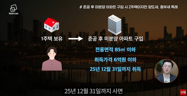 다만 조건이 있는데요. 먼저 내가 주택이 한 채 있는 상태에서 준공 후 미분양 주택을 취득해야 합니다. 두 번째로 추가로 취득한 주책이 전용면적 85㎡ 이하 국민평형에 취득가액 6억 원 이하여야 합니다. 세 번째로 25년 12월 31일까지 취득해야 합니다.