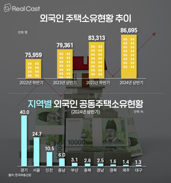외국인 소유 주택도 매년 증가하고 있습니다. 한국부동산원에 따르면, 외국인 공동주택소유현황은 2022년 하반기 7만5959명에서 2024년 상반기 8만6695명으로 14.1% 늘었습니다.