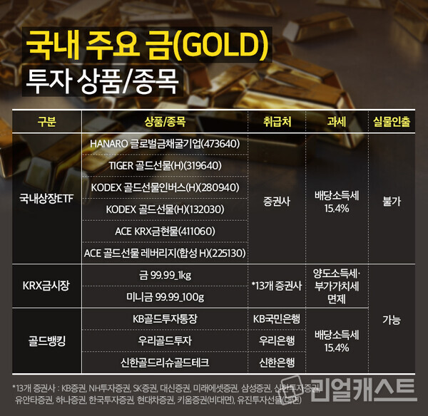 단, 국내 상장된 금 시세 관련 ETF의 경우 거래에 따른 소정의 수수료가 발생한다는 점과, 매매차익에 대한 배당소득세(15.4%)가 부과됩니다. 금 실물을 인출할 수 없다는 점도 고려해야 합니다. 금 실물에 관심이 있다면 ETF 이외에 다른 방법을 취해야 합니다.
