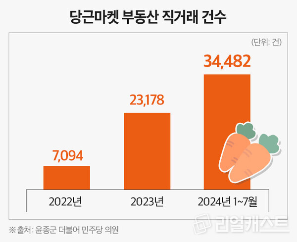 국토교통위원회 윤종군 더불어민주당 의원실이 중고거래 플랫폼인 당근마켓으로부터 받은 자료에 따르면 2022년 7,094건이던 당근마켓 부동산 거래 건수는 2023년 2만3,178건으로 3배 이상 증가했으며 2024년은 1~7월까지 집계 건수가 3만4,482건으로 전년 전체 거래 건수를 훌쩍 넘어섰다.
