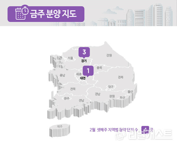 부동산인포에 따르면 2월 3주 전국에서 신규 청약 및 입주자를 모집하는 곳은 4곳, 총 3,041가구로 집계됐습니다(총 가구수 기준).