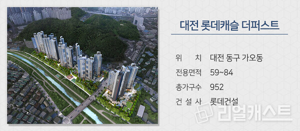 대전에서는 롯데건설이 동구 가오동에 짓는 ‘대전 롯데캐슬 더퍼스트’를 분양합니다. 대전에 첫 공급되는 롯데캐슬 단지입니다. 대전지역 최초로 최고층에 입주민 전용 ‘스카이라운지’가 조성되며 대전 최초의 스카이 게스트하우스도 들어설 예정입니다. 대전천 조망 및 보문산, 식장산을 조망할 수 있습니다. .