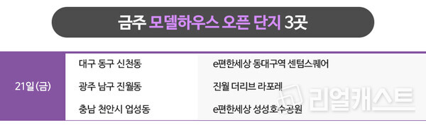 금주 모델하우스 오픈 예정인 곳은 3곳입니다. 대구, 광주, 충남 천안 등 모두 지방권입니다.