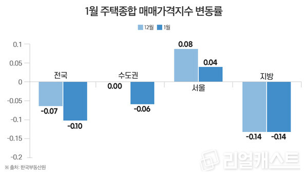 한국부동산원이 발표한 ‘1월 전국주택가격동향 조사 결과’에 따르면 1월 전국 주택종합 매매가격 지수는 -0.10%으로 지난달(-0.07%)보다 0.03% 포인트 하락이 깊어졌다.