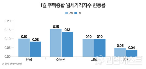 수도권은 0.13%, 서울은 0.10%를 기록했으며 지방도 0.04%로 매매, 전세와 다른 흐름을 보였다.