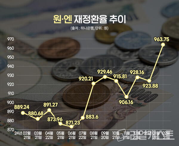 원·엔 재정환율은 지난 21일 종가 기준 100엔당 963.75원을 기록하며 최근 1년 사이 가장 높은 수준까지 올랐으며 최근 3개월만 놓고 살펴보면 6.35%가 상승한 수치입니다.