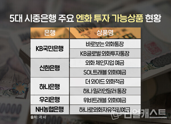 이런 가운데 지금이라도 일본 엔화에 대한 투자에 나서야하는 것이 아닌가 생각하는 분들이 있다면 은행권에서 일본 엔화에 투자할 수 있는 상품에 대해 참고해보시면 좋겠습니다.