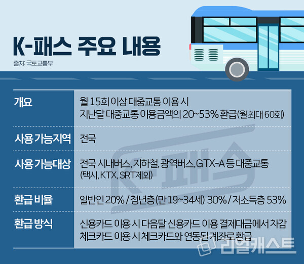 K-패스란 월 15회 이상 정기적으로 대중교통(시내·마을버스, 지하철, 광역버스, GTX 대상)을 이용할 경우 전달 지출금액의 일정비율을 다음 달에 환급해주는 교통카드입니다. 일정 시간 내 환승할 경우 1회 이용으로 간주되며 서민들의 교통비 부담을 줄여주는 역할을 수행해왔습니다. 환급 비율은 ▲일반인 20% ▲청년층(만 19~34세) 30% ▲저소득층 53%입니다.
