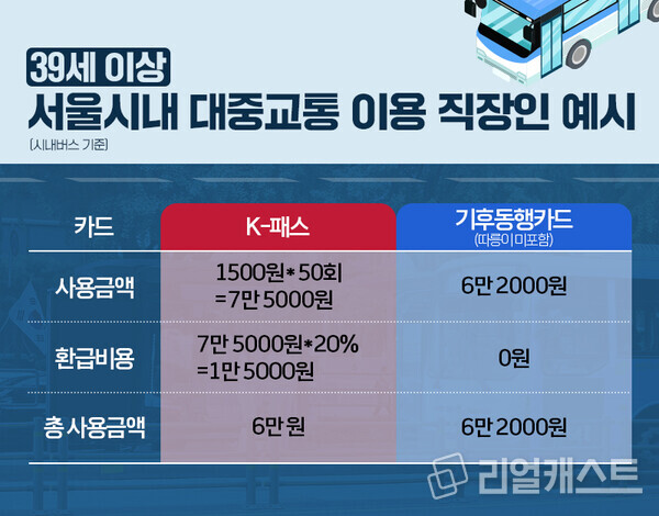 39세 이상 직장인이 서울 시내버스(1회 탑승 시 1500원)를 기준으로 계산해보자면 월 50회를 탈 경우에는 일반적으로는 7만 5000원을 사용하게 됩니다. 이때 K-패스 카드를 사용했다면 일반인 기준 20%(1만 5000원)를 환급 받아 실제로 사용한 교통비는 6만 원이 됩니다. 기후통행카드가 월 6만 2000원(따릉이 제외)인 것으로 고려하면 K-패스카드가 2000원을 아낄 수 있는 것입니다. 반면 월 52회 이상 시내버스를 이용하는 분이라면 기후동행카드가 더 유리합니다.