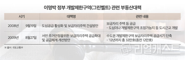 2008년 집권하기 시작한 이명박 정부도 부동산 시장 침체와 금융위기 등으로 경기 회복에 적극적으로 나서며 집권 초기부터 그린벨트 해제를 활용하기에 나섰다.