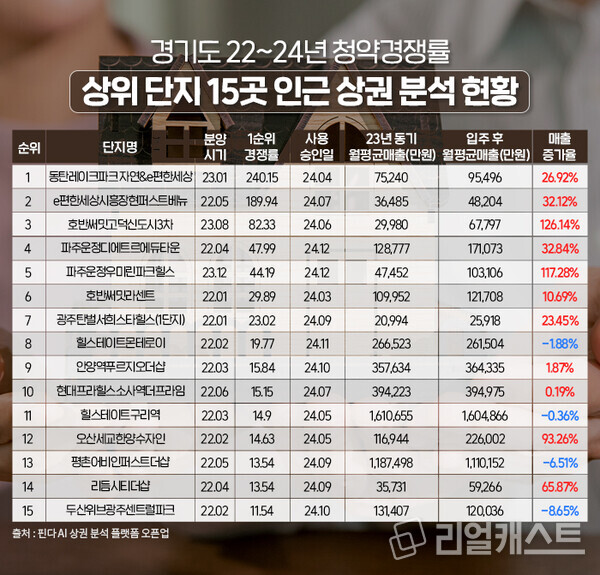 조사대상은 지난 2022년부터 2024년까지 경기도에서 청약을 진행했던 아파트 중 지난해 입주를 시작한 단지들로 추렸으며 이중 1순위 경쟁률이 높았던 상위 15개 아파트로 선정했습니다.