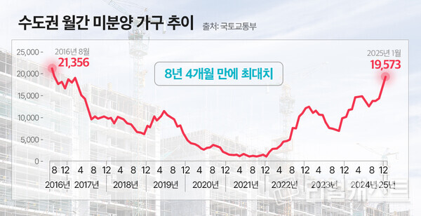 국토교통부 ‘1월 월간 주택 통계’에 따르면 수도권 미분양 가구는 1만 9,573가구로 지난 2016년 8월(2만 1,356가구) 이후 8년 4개월 만에 최대치를 기록했다. 전달보다는 15.2%가 증가하는 등 지난해 9월 이후로 매달 미분양 가구가 증가했다.