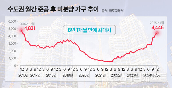 이뿐만이 아니다. 악성으로 분류되는 준공 후 미분양도 4,446가구로 2016년 12월(4,821가구) 이후 8년 1개월 만에 가장 많이 쌓여 있는 것으로 나타났다.