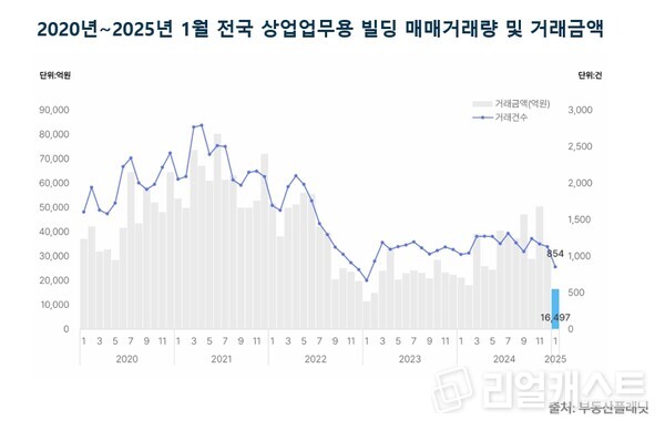 빅데이터 및 AI 기반 상업용 부동산 전문기업 부동산플래닛의 ‘2025년 1월 전국 상업·업무용 빌딩 거래 시장 분석 결과’ 보고서에 따르면 지난 1월 전국에서는 총 854건의 상업·업무용 빌딩 거래가 있었다.