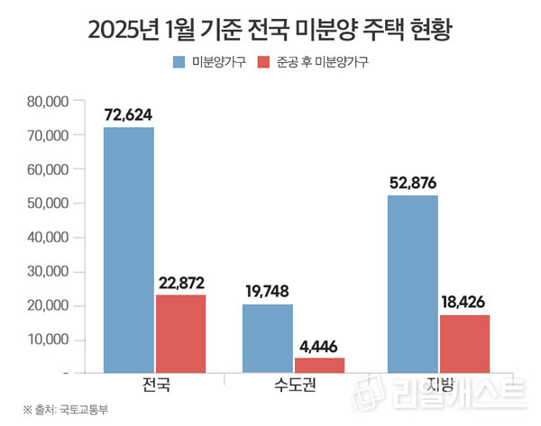 1월 기준, 전국의 미분양 주택은 7만 2,624가구다. 이중 지방이 5만 2,876가구로 큰 비중을 차지하고 있다. 하지만 수도권도 약 2만 가구(1만 9,748가구)에 달해 업계에서는 지방뿐 아니라 수도권도 미분양 해소 대책을 적용받아야 한다고 목소리도 나오고 있다.