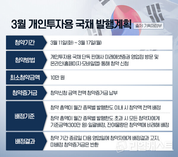 개인투자용 국채 구입을 희망하는 개인투자자는 청약 기간에 판매 대행 기관(미래에셋증권)의 영업점을 방문하거나 온라인(홈페이지·모바일앱) 등을 통해서 청약하면 됩니다. 청약 기간은 3월 11일(화)~17일(월)까지며, 청약 시간은 영업일 오전 9시~오후 4시까지입니다.