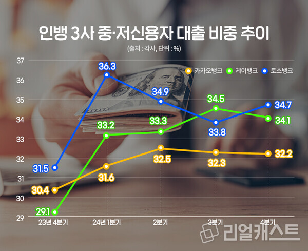 인터넷전문은행(이하 인뱅) 3사가 모두 중·저신용자 대출 비중이 4개 분기 연속 30%를 웃돈 것으로 나타났습니다.