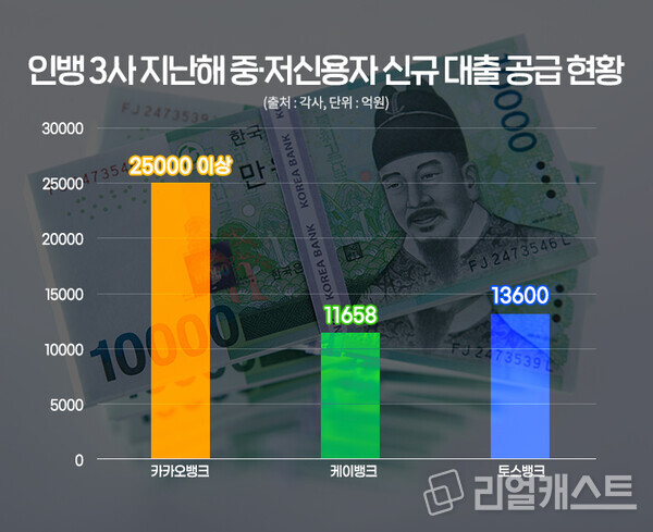 금융권에 따르면 인뱅 3사의 지난해 말 기준 중·저신용자 대상 대출 비중(잔액기준)은 카카오뱅크 32.2%, 케이뱅크 34.1%, 토스뱅크 34.7%로 각각 집계됐습니다.