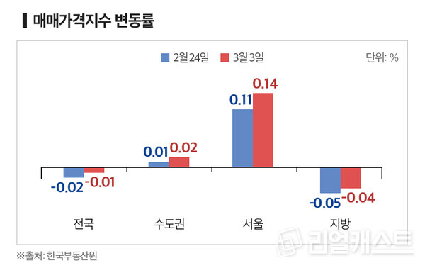 권역별로는 수도권이 0.02%로 전주(0.01%)보다 0.01%p 더 상승했다. 지방은 -0.04%로 전주(-0.05%)보다 0.01%p 하락폭이 줄어들었다.