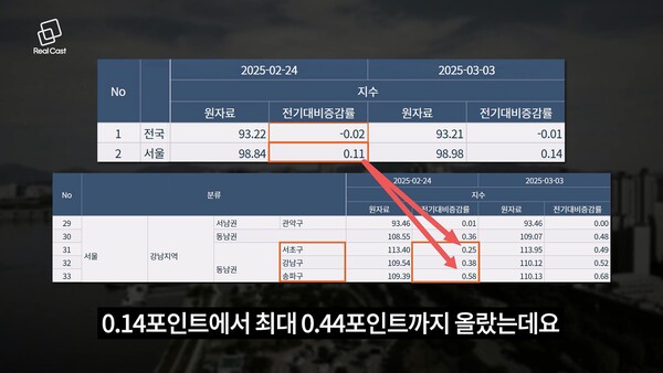 서울 상승의 중심에는 강남이 있습니다. 강남구(0.38%), 서초구(0.25%), 송파구(0.58%)만 봐도 서울 전체 상승률 대비 3~5배 가량 높습니다.